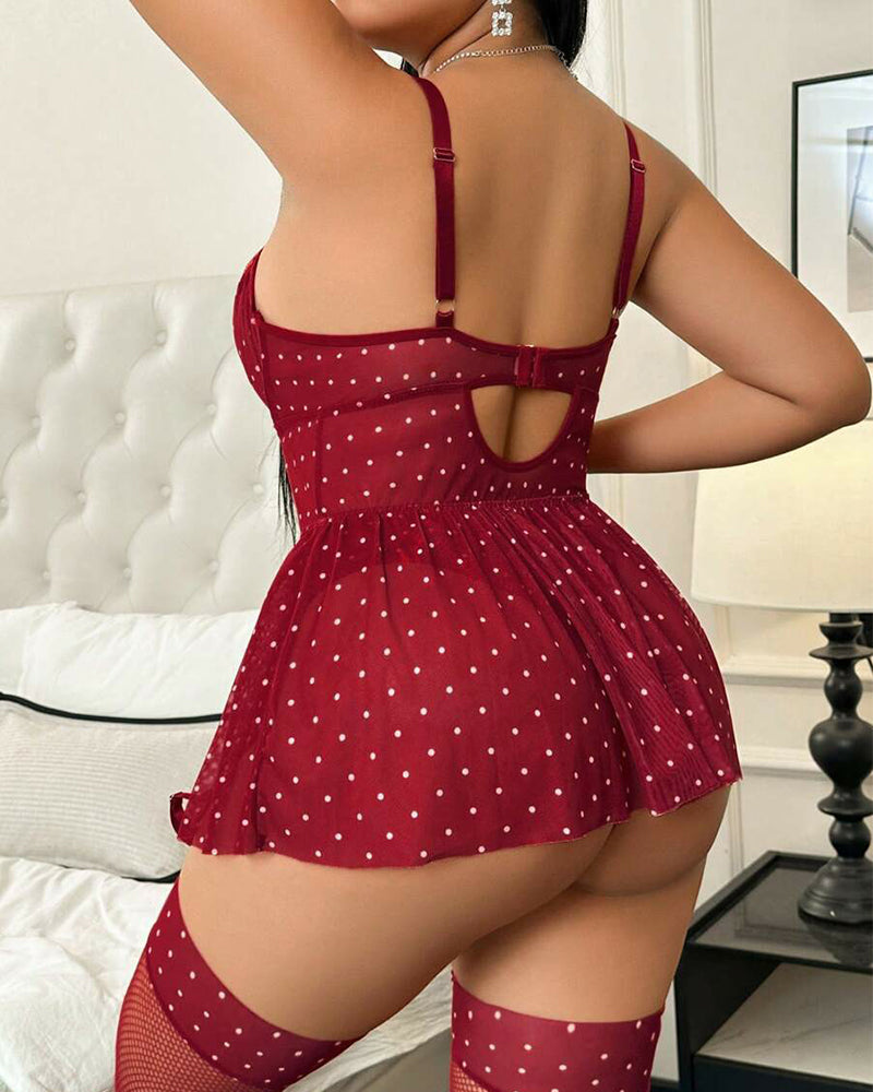 This nightie set is playful, flirty, and flattering. The sheer mesh combined with lace and polka dots hugs your curves while keeping you comfortable all night. Adjustable straps and a soft stretch ensure the perfect fit. Wear it solo to feel sexy and confident, or surprise your partner for a romantic evening—the three-piece set makes it easy to feel bold, beautiful, and irresistible.