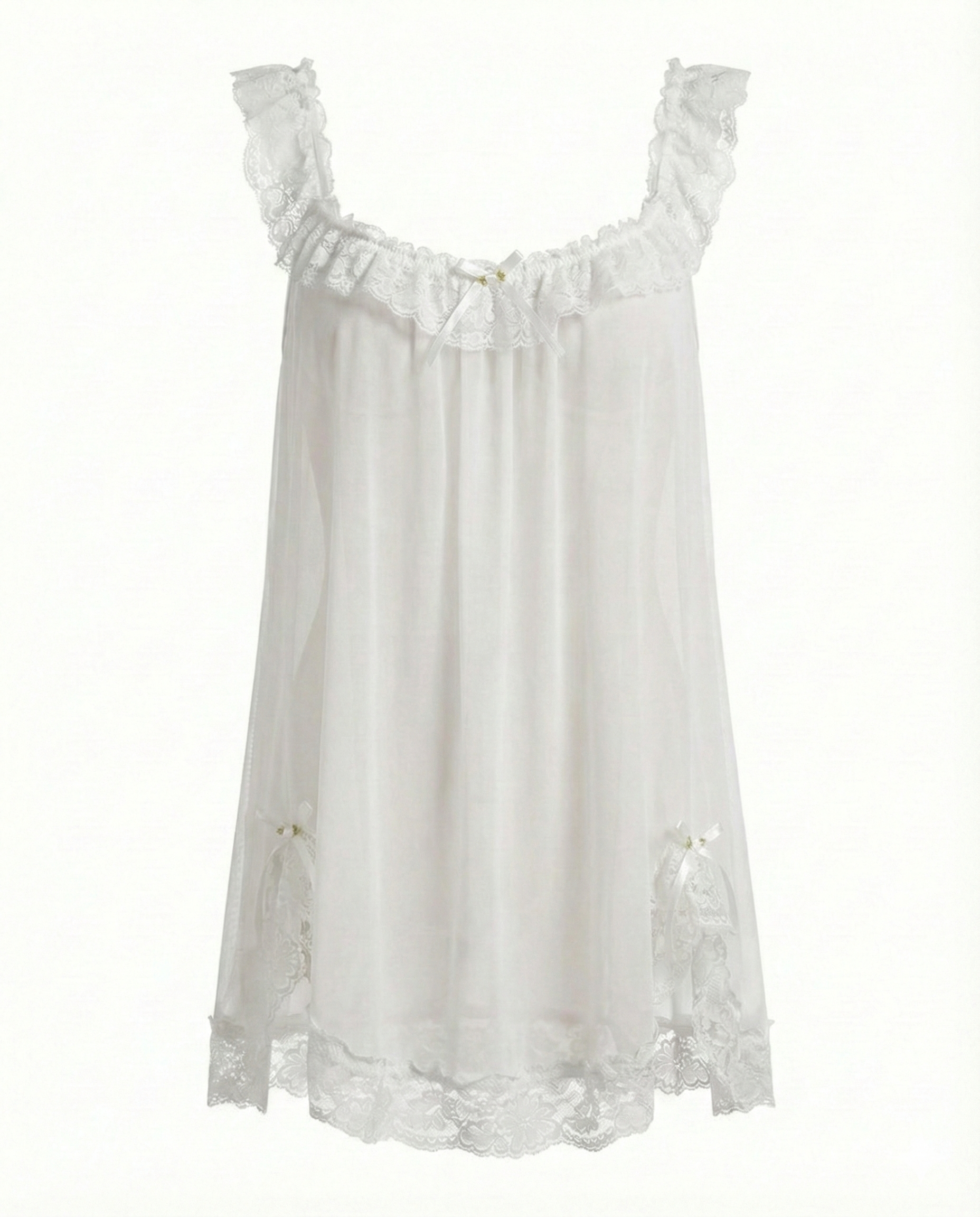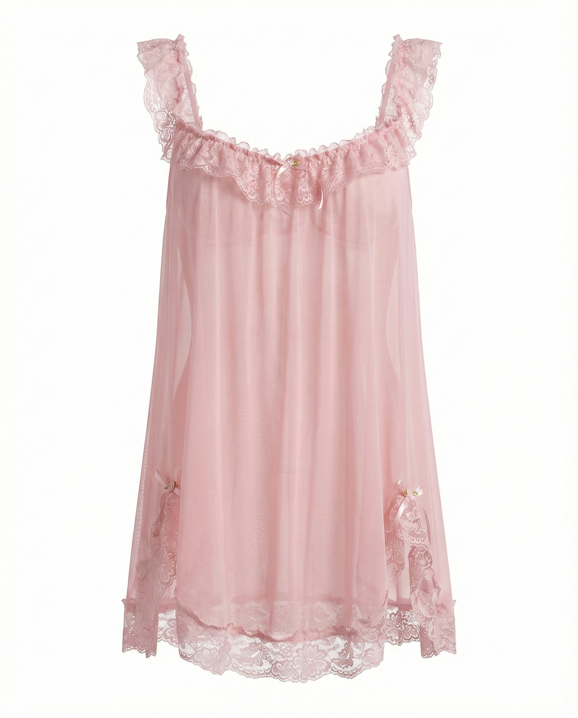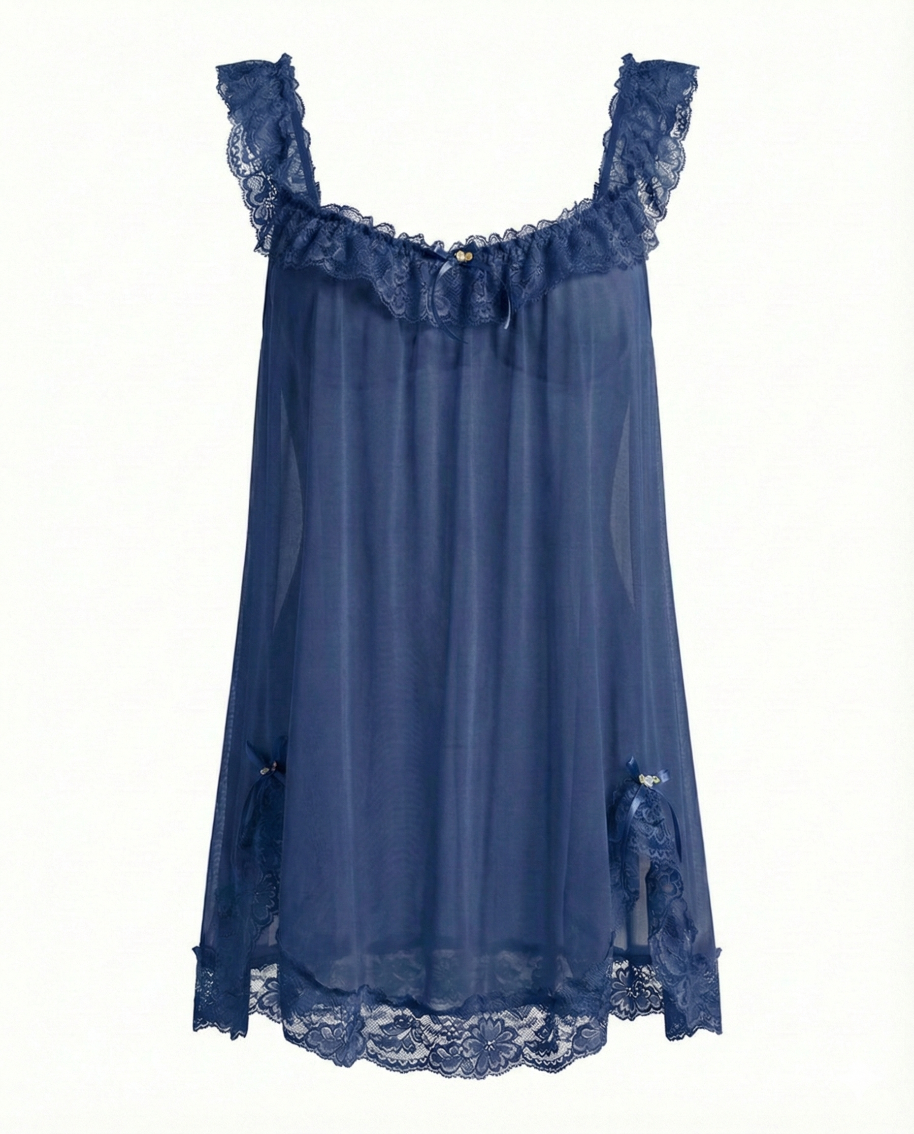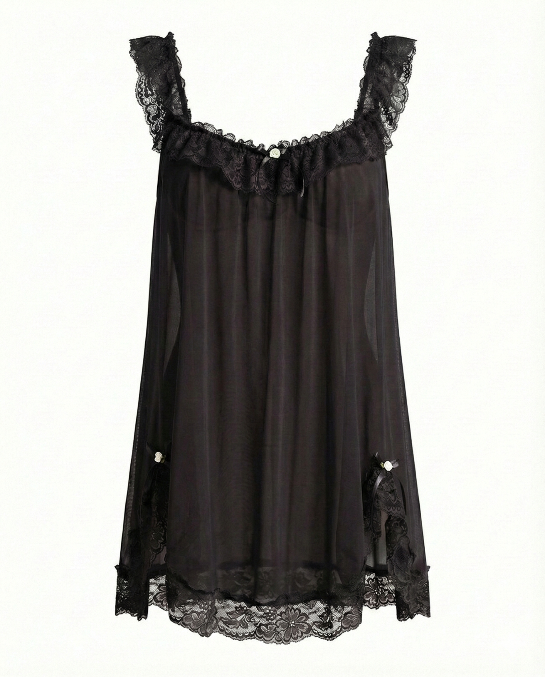 • Sheer Mesh & Lace Trim: Delicate contrast lace and frill detailing enhance the neckline and hem, creating a feminine and alluring look.
