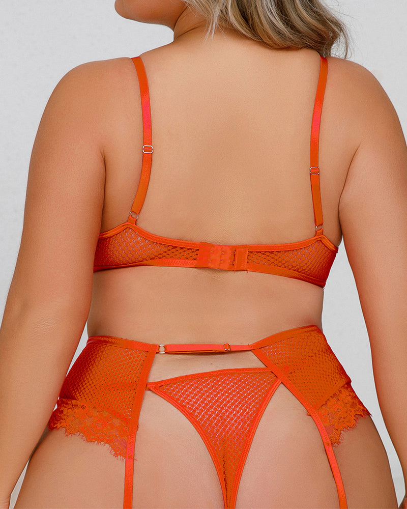 This plus size fishnet lace underwire 4-piece set is made for women who love bold, sexy confidence. The combination of supportive underwire, sheer textures, and strappy details creates a powerful look that celebrates your curves without compromise.